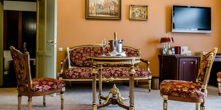 Business Deluxe Suite is situated on the 3rd floor with a view of the famous Esplanade park and Art Academy. Business Deluxe Suite has spacious bedroom with a king size bed 1.8 x 2 m bed, 2 bathrooms & 2 toilets (one with the shower and the second – with a bathtub) and charming business room, which is ideal for small business meetings, private breakfast or just coffee with partners and friends.