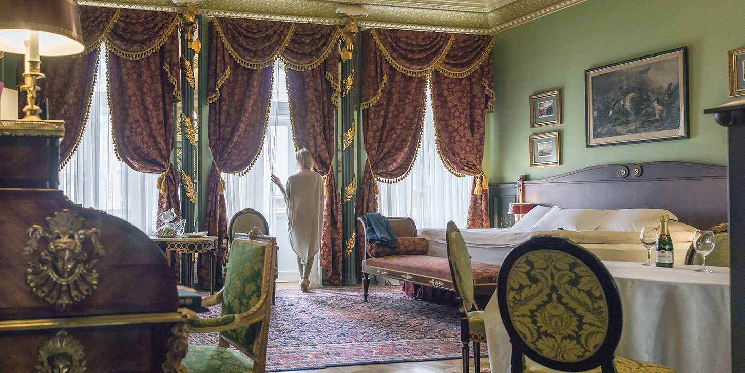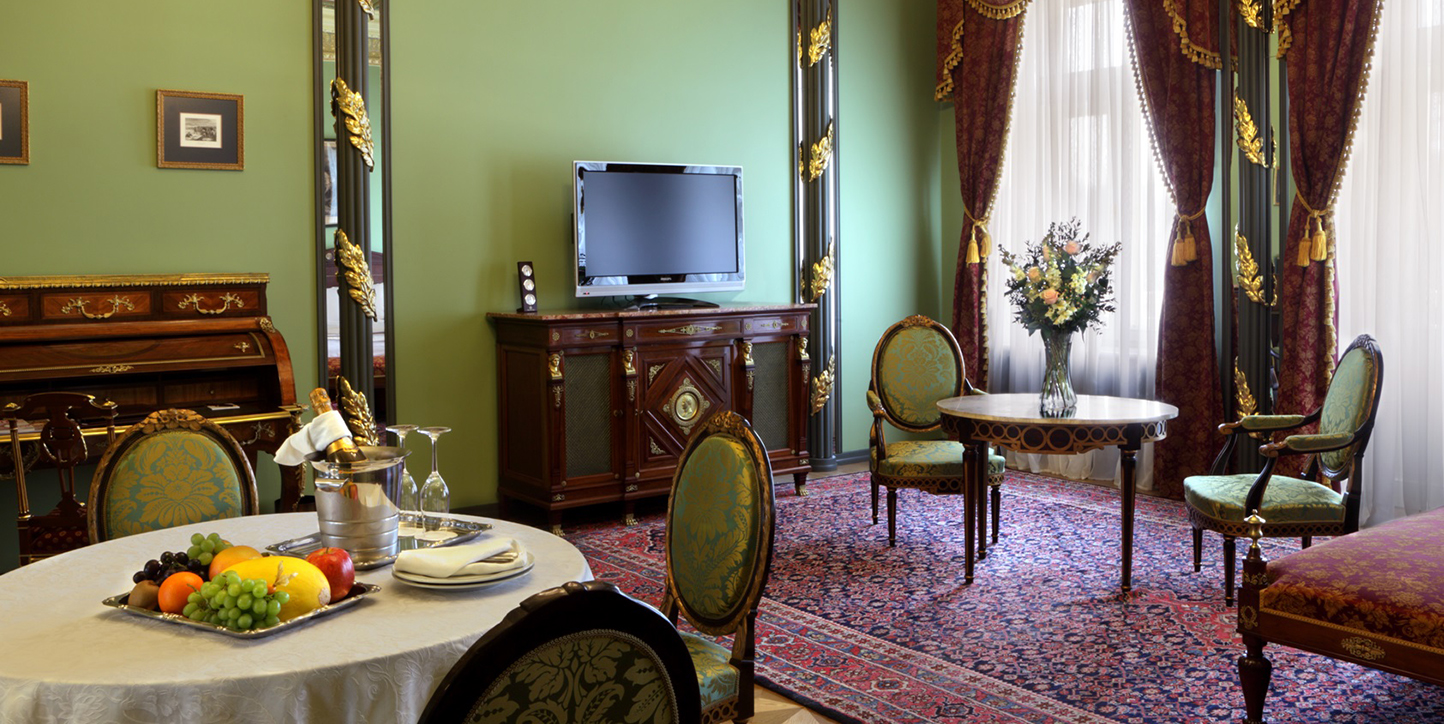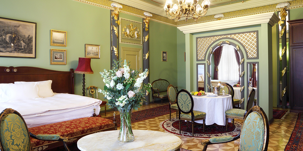 Luxurious Imperial Suite is elegance at its absolute. It is the most noble of all luxury suites in Latvia and is awarded the Best Luxury Suite in Latvia by World Travel Awards. Unique grandeur French Napoleon III style interior, high ceilings with decorations and hand-paintings, is complemented by collectible antique pieces of art acquired in the Europe’s leading auction houses. The en- suite bathroom is decked with the world famous Carrara marble- Gallo Nero. The en suite 35 sq.m. private terrace lies among linden and chestnut greenery and offers you the enjoyment of a secluded private dinner or a glass of wine or cup of coffee overlooking Riga' s historic grand views and parks. Take a delight and warm-up in Gallery SPA sauna or swim in a jet-stream swimming pool, book a massage or exquisite Carita facial that can be arranged right in your suite. A personal assistant' s service will ensure all your special wishes come true during your stay here at the Imperial Suite and Riga.